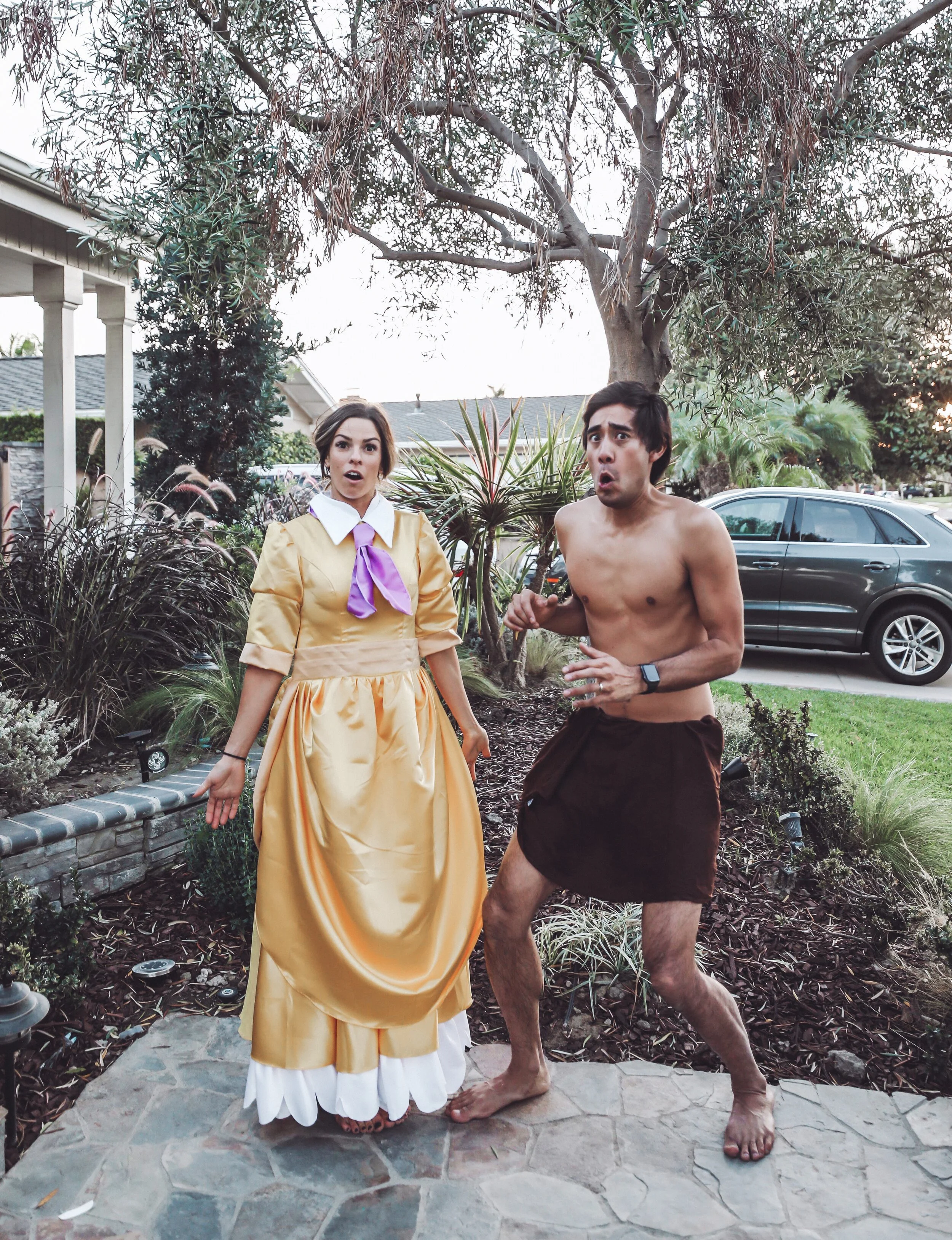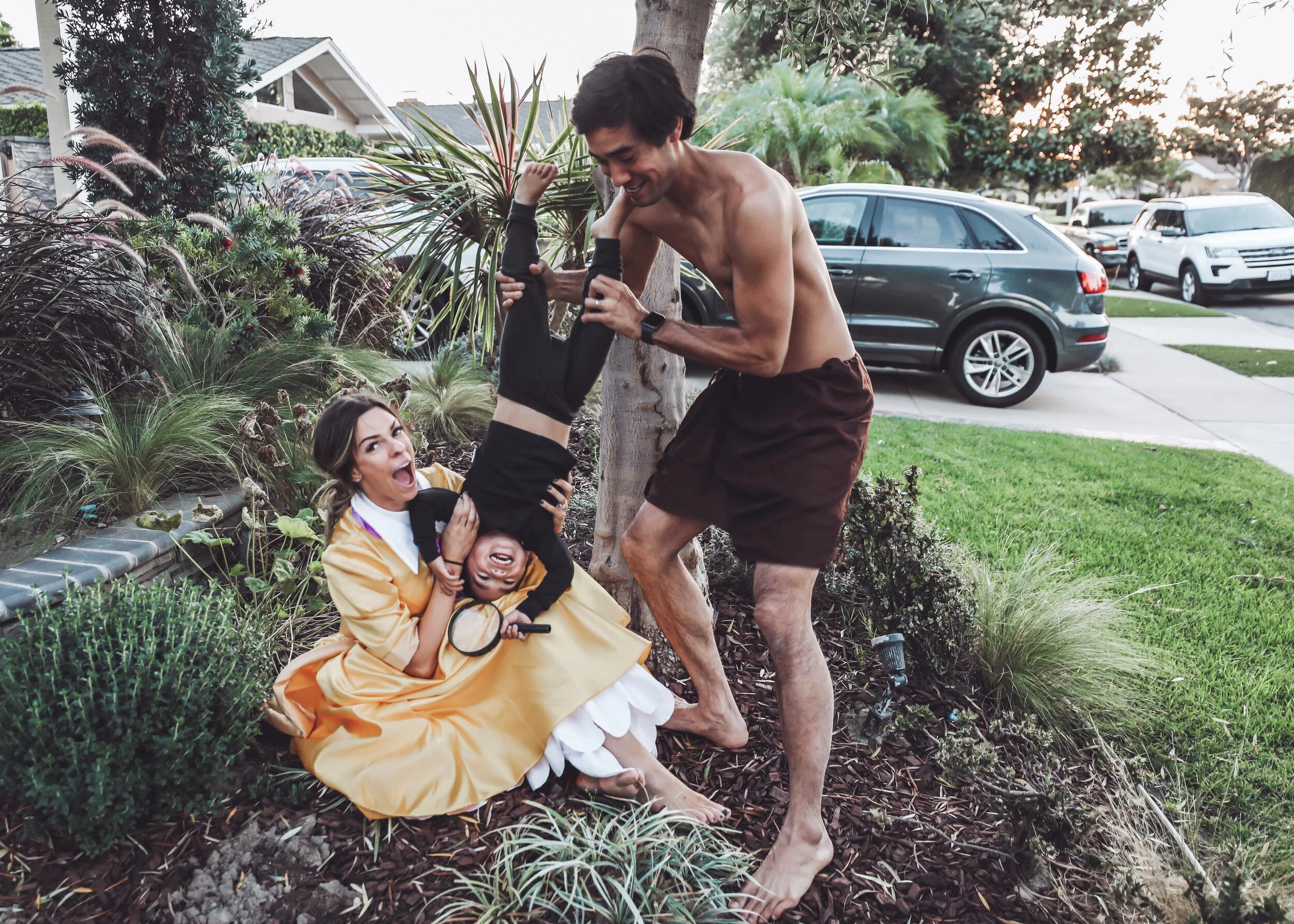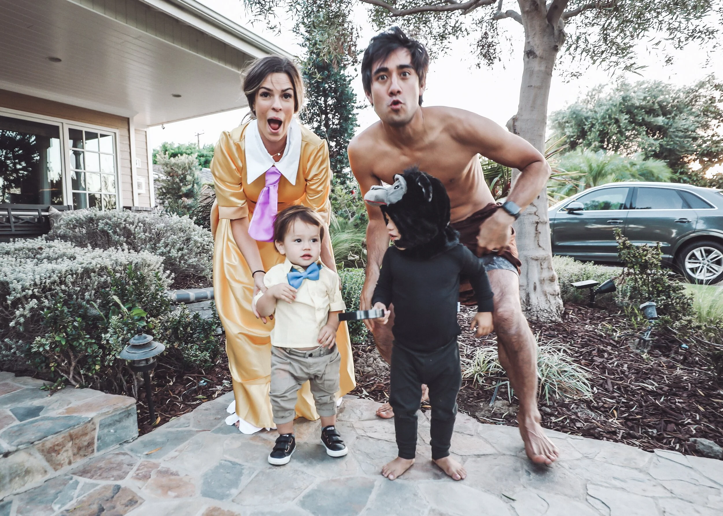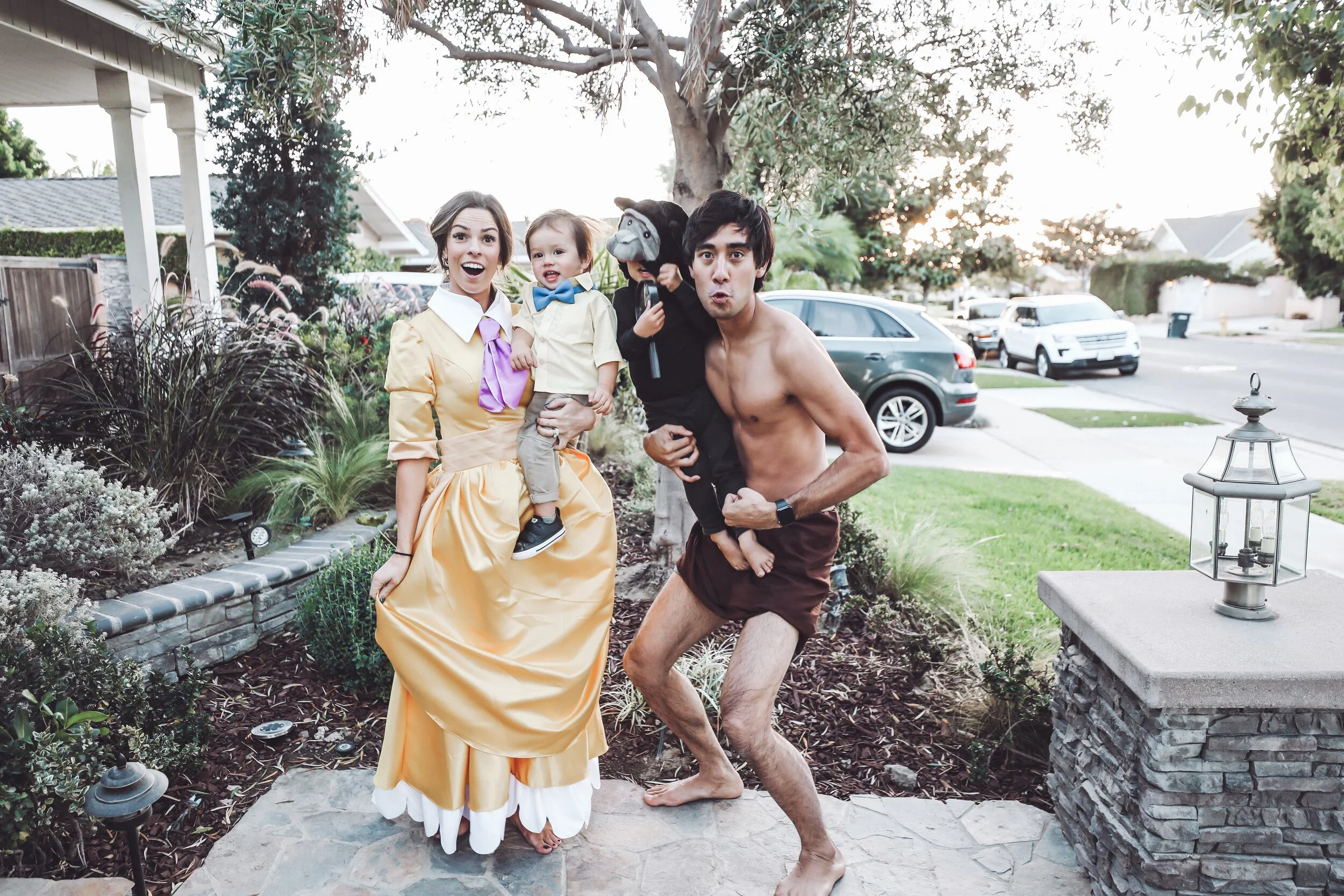 When I asked Zach if we could do another family costume, he was fully on board. He really is the best dad and husband. He was even a little excited when I told him we were going to take on Tarzan. (Thank goodness we live in California, because his costume was a little lacking, haha!). We had so much fun taking our photos, but I’ll be real with you, it wasn’t as “pretty” as it seems. We definitely needed candy bribery for Mason and had to modify both boys’ costumes due to the lack of cooperation on their part. I love making these memories and I know it’s building a foundation in the boys for our family celebrations to come, but it’s not always easy. Mason is very sensitive to the things he wears so while he had a fabulous full gorilla costume, all I could get him to wear was black pajamas and his gorilla hat (and even that was worn thanks to bribery). Liam did not want to smile whatsoever and both took off running down the sidewalk multiple times. It was hilarious, stressful and sweet all at once.